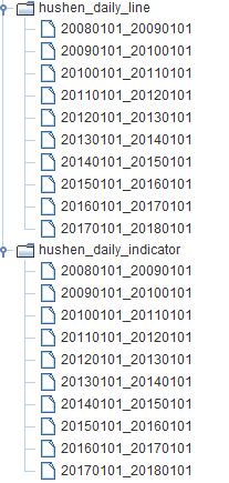 由于日线行情和每日指标数据的分区方案相同,因此把它们存放在同一个数据库dfs://tushare的两个表中,hushen_daily_line用于存放日线行情数据,hushen_daily_indicator用于存放每日指标数据。如果需要使用内存数据库,创建数据库时把