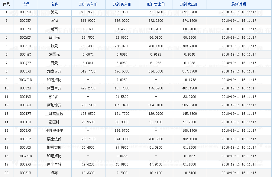 中国银行外汇牌价 2018-12-11(图片来源:东方财富网)