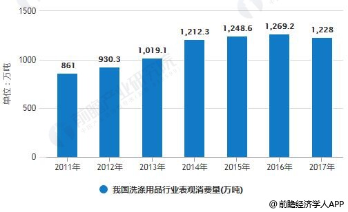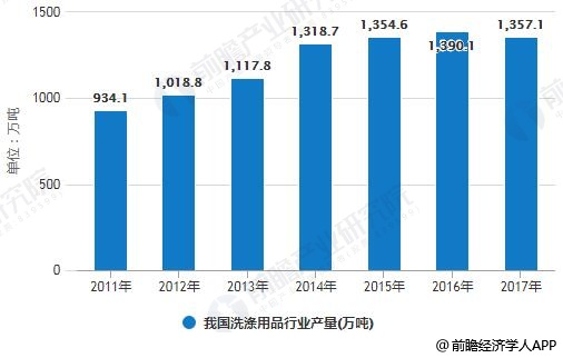 2011年我国洗涤用品行业产量为934.1万吨,行业表观消费量为861万吨。到了2012年我国洗涤用品行业产量超1000万吨。截止到2017年我国洗涤用品行业产量约1357.1万吨,产量同比2016年有所下降。行业表观消费量为12228万吨。
