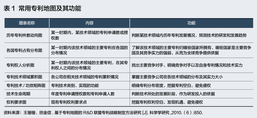 根据需要,专利检索可以形成如表1所示的多种专利地图,进而组成专利全景,以支持企业专利战略的决策。
