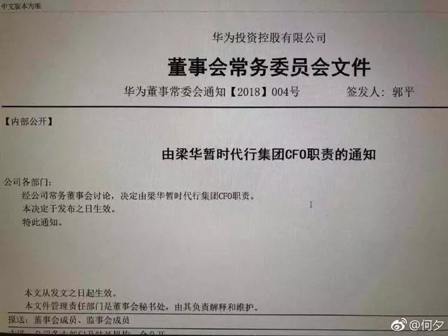 据路透社报道,华为公司内部已经任命董事长梁华暂时代行集团CFO职务。梁华是继孙亚芳之后,新选举上任的董事长,也曾经担任过华为的CFO。
