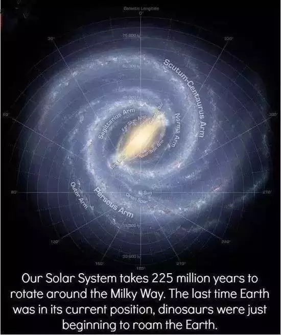 我们的太阳系会花上2.25亿年绕行银河系,上一次地球在同一个位置的时候,恐龙都还存在着。