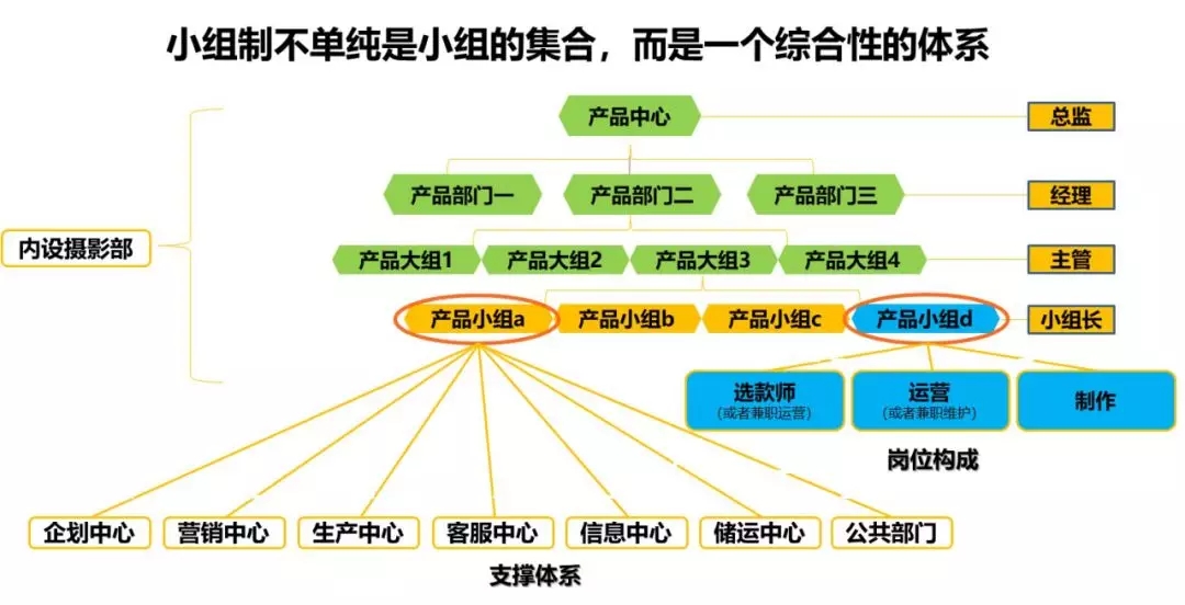 但是,小组制不单单是小组的集合,而是一个综合性的体系,以产品小组为核心,还有企划中心、营销中心、生产中心、客服中心、信息中心、储运中心、公共部门等为支持,去开展工作。充分减少决策层级,调动一线员工积极性,让听得到炮声的人去做决策,提高了市场反应速度。