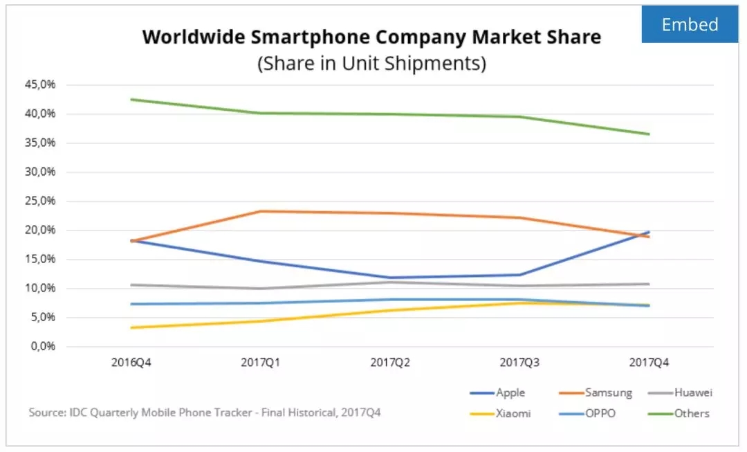 全球智能手机市场份额(16Q4-17Q4)