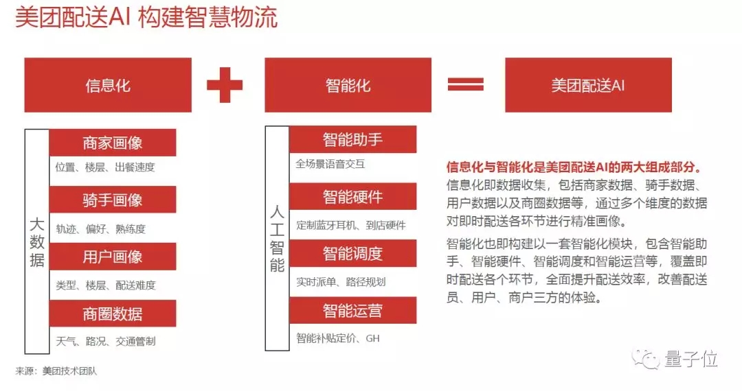 美团也解释过基本原理,先通过感知将线下业务数字化,再对这些“大数据”进行分析,然后“智能化”打造AI模型,最终应用于落地配送,让AI无所不在。