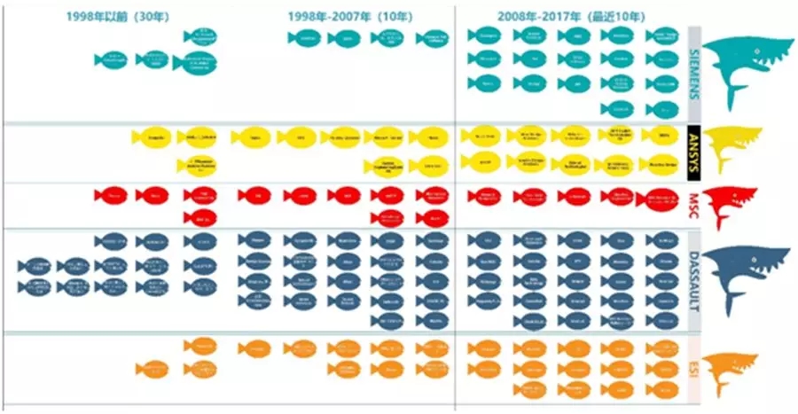 在翻看国外工业仿真软件CAE巨头的鲨鱼进化史中,我们发现这些行业先锋能活到今天,充满了疯狂并购的味道。在过去十年中,仅仅行业的Top5的仿真软件公司,并购次数高达65次。每一次整合,都会酝酿出一个更大的知识火山。人类工业知识迅速聚集,使得这些工业软件企业,成为工业界最聪明的工业公司。