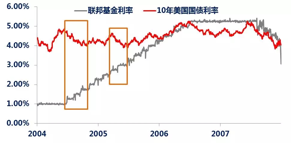 除上述两个因素之外,对于美债期限利差倒挂的解读,还存在“格林斯潘之谜”——即在格林斯潘任联储主席期间,美联储曾于2003年6月至2006年6月期间,将联邦基准利率由1%提升至5.25%,但是期间10年美债利率不仅没有跟随上行,反而曾阶段性出现下降。对此“迷”的一个解释,就是中国等外国央行在此期间增持了不少美债,进而拉低了美债利率。