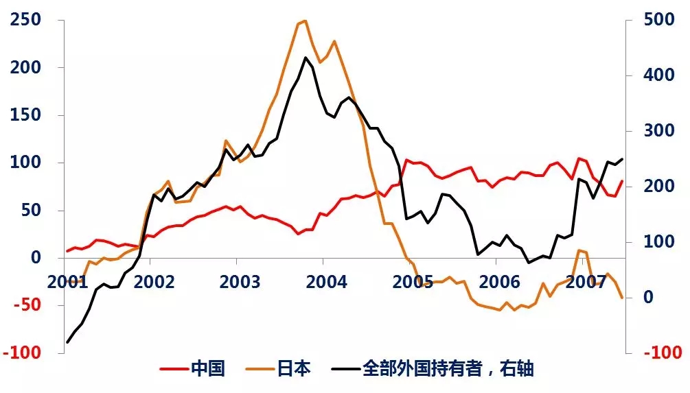 当时,确实中国、日本等出口顺差国积累了不少外汇储备,用于购买美国国债,例如,中国增持美债的速度由2003年年中的54亿美元/年升至2005年年中的104亿美元/年;同期日本增持速度虽有所回落,但在2005年之前维持在100亿美元/年左右;而全部外国投资者的速度则维持在300亿美元/年左右。