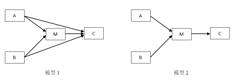 观点2:进一步检验模型1中的路径A→C和B→C的显著性,如果显著,应采用部分中介模型,如果不显著,应采用完全中介模型。