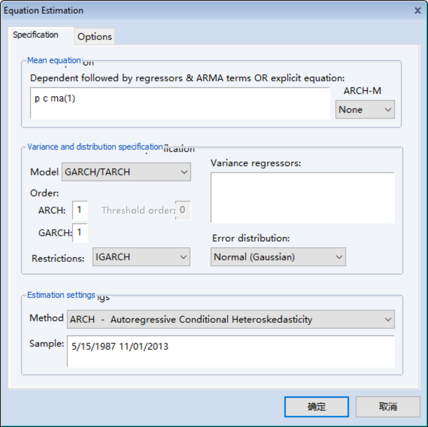 The_Icer 发表于 2018-12-14 19:36 想请教大家一下如何用EVIEWS做IGARCH呢?我无论用什么数据,什么形式回归一直会报错不知道为什么。