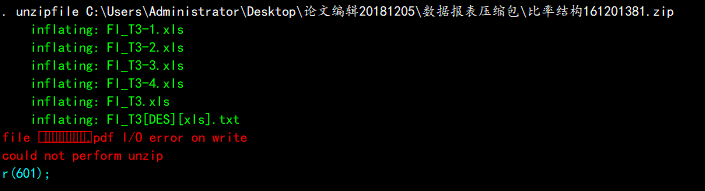 各位好,我使用STATA14.2的unzipfile命令,在解压缩包时,碰到了下述问题,不知如何解决,恳请大家赐教。谢谢。
