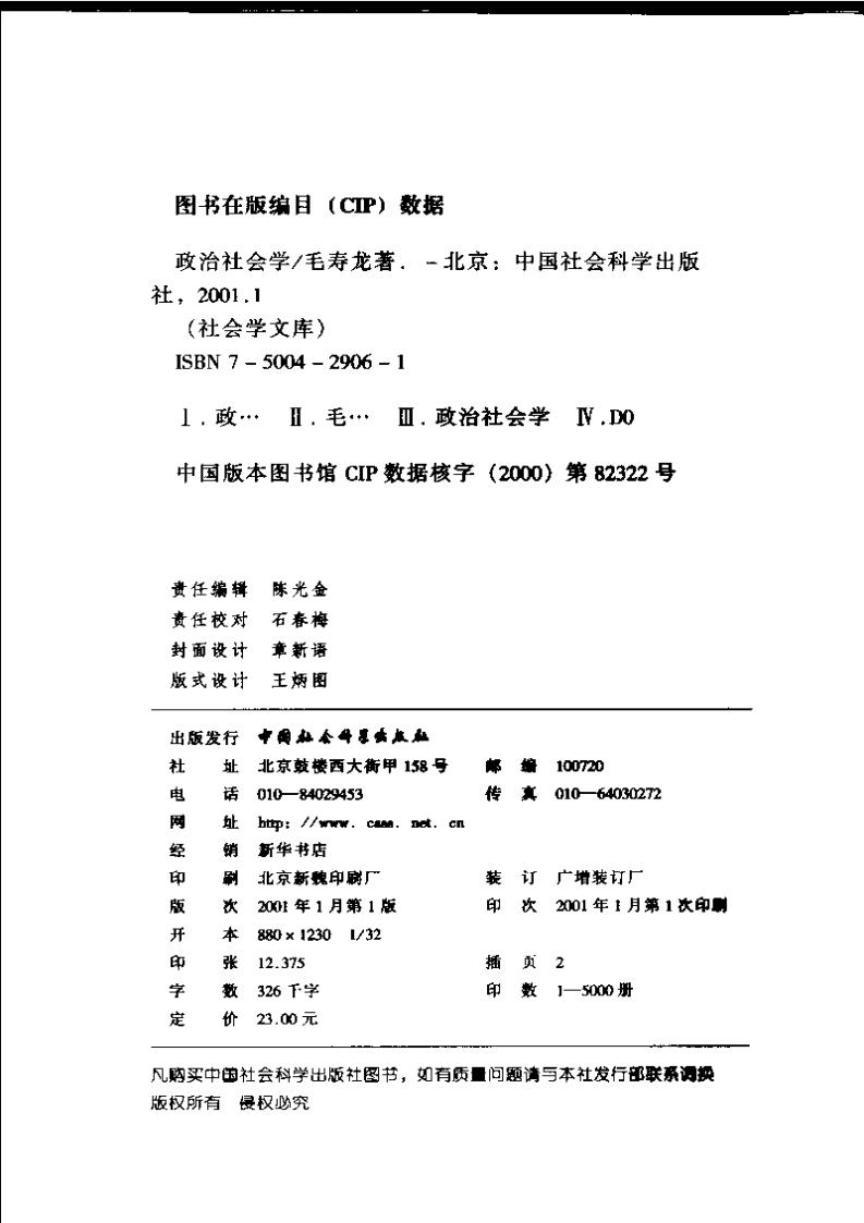 【参考文献格式】毛寿龙著. 政治社会学. 中国社会科学出版社, 2001.