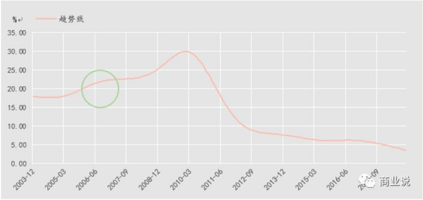 第三张图,我们将GDP增速与居民可支配收入销量增速的长期趋势摆在了一起。两者的拐点都在2006年前后,而且这之后两者的下跌趋势高度相关,相关系数我测了,0.8528,非常显著。至于2006年之前,二者关系为什么是那样的,我以后专门撰文说,那是个纯经济学话题,我们只要记住当前居民可支配收入增速与GDP增速高度相关,且同步下滑即可。