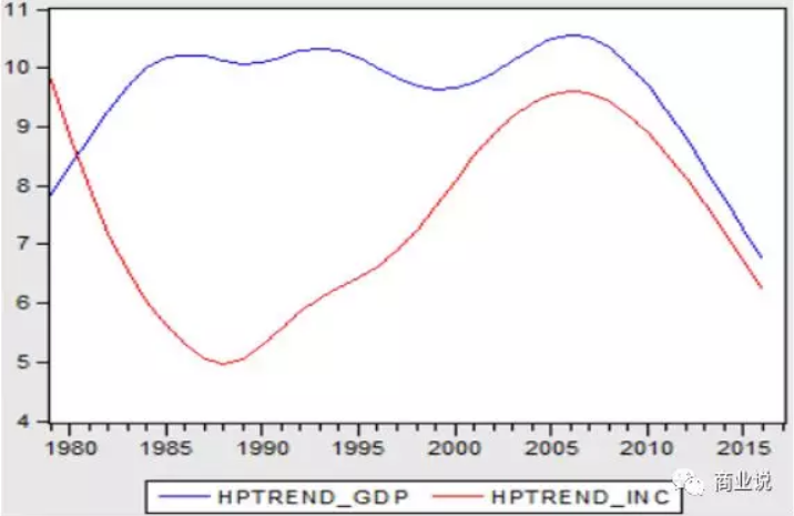 所以我对我要观察的几个关键指标,我都做了HP滤波(不用纠结这是啥,就是一个排除短期因素看趋势的工具)。得到了以下三张图。