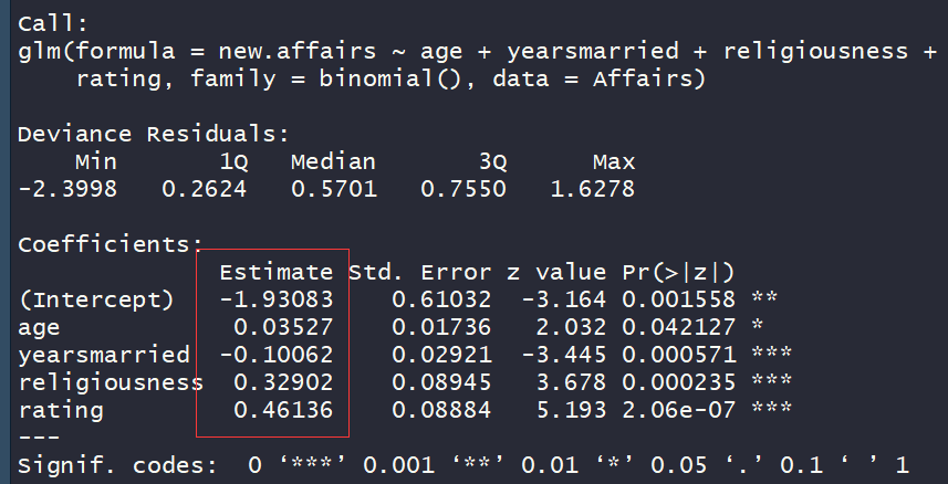 《R语言实战》书中 广义线性模型的章节中婚外情模型系数和自己用R算出来的正负相反?
