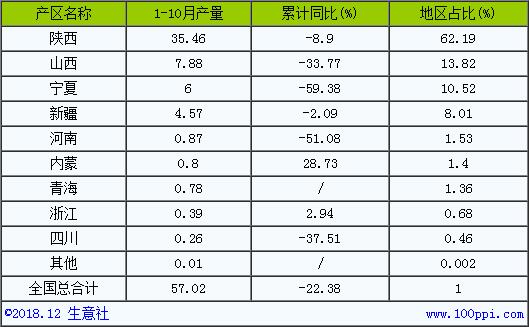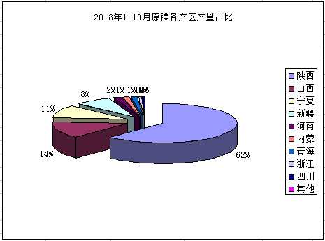 据中国有色金属工业协会数据显示,2018年1-10月中国共产原镁57.02万吨,较去年同期同比减少22.38%。其中主产区陕西地区1-10月原镁累计生产35.46万吨,同比减少8.9%;山西地区1-10月原镁累计生产7.88万吨,同比减少33.77%;宁夏地区1-10月原镁累计生产6万吨,同比减少59.38%;新疆地区1-10月原镁累计生产4.57万吨,同比减少2.09%。