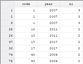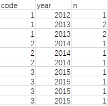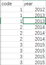 (1)当code和year都相同时,则n取值为1(如下图code=2 & year=2014,以及code=3 & year=2015所示)。