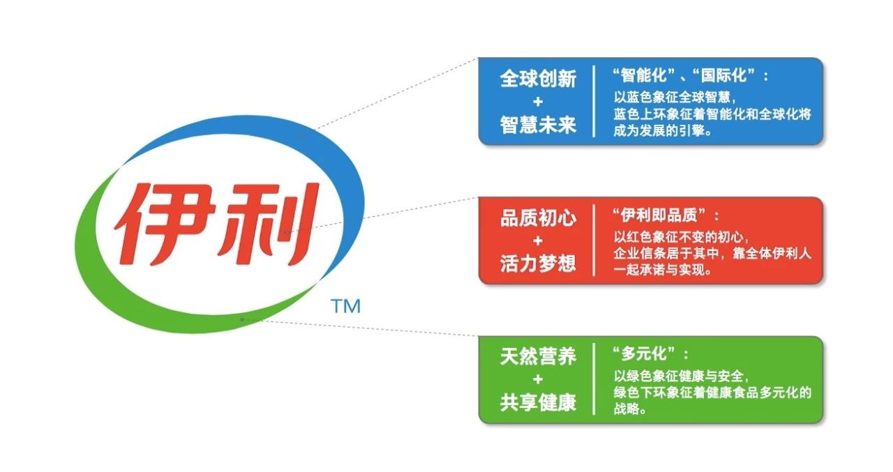 回顾伊利品牌史,总共经历过3次升级。每一次都是其战略和企业文化的集中体现。2000年,是伊利从内蒙古地方性品牌走向全国的发展壮大期,那一年的品牌标识以红色的伊利文字和右上角的蓝绿曲线,向全国宣告伊利来自草原的品质初心。2010年,经历奥运和世博盛会,伊利成长为中国乳业领导者,那一年升级的品牌标识以蓝绿色的椭圆围绕红色的伊利文字,象征蓝天绿地中的优质营养,宣示伊利不仅是健康食品提供者、更是健康生活方式倡导者的品牌承诺。