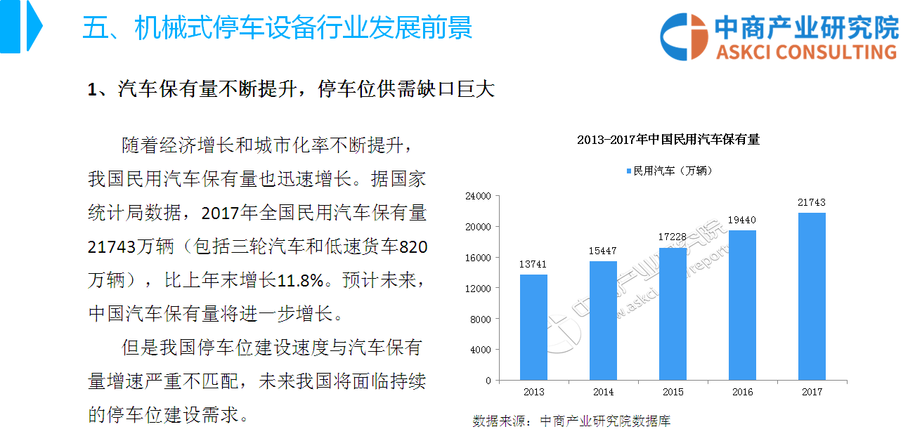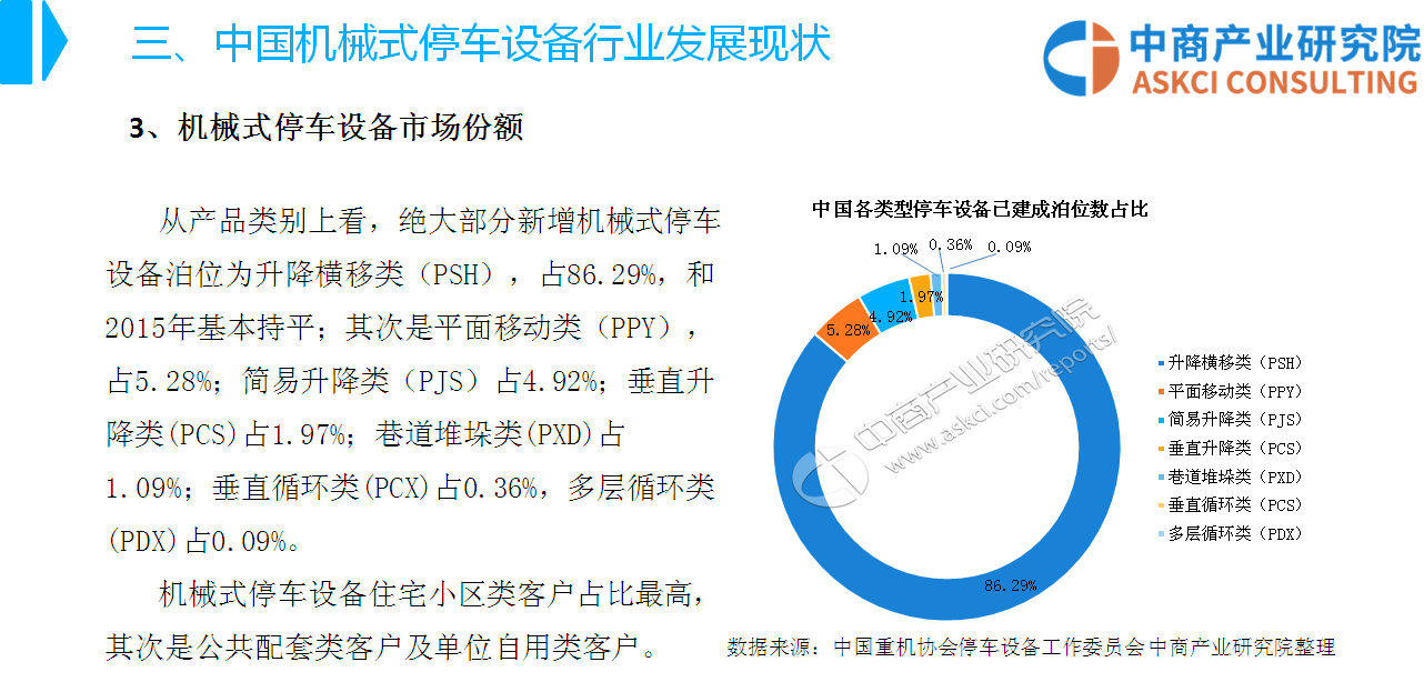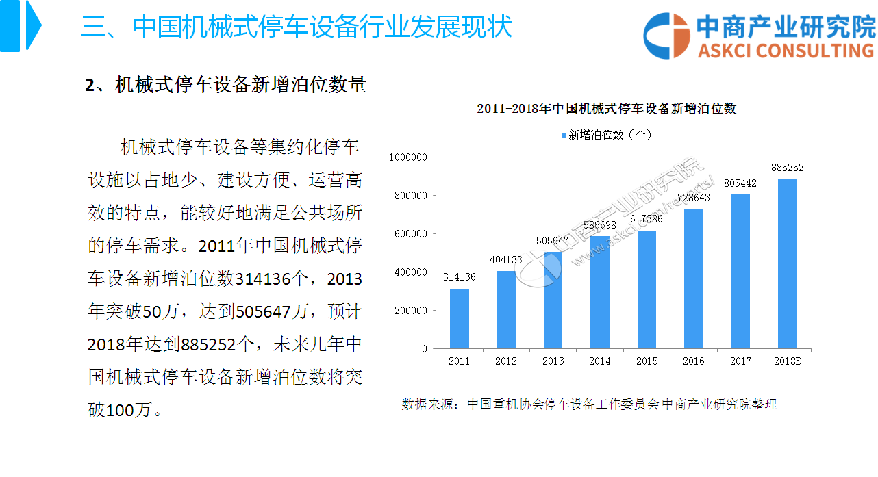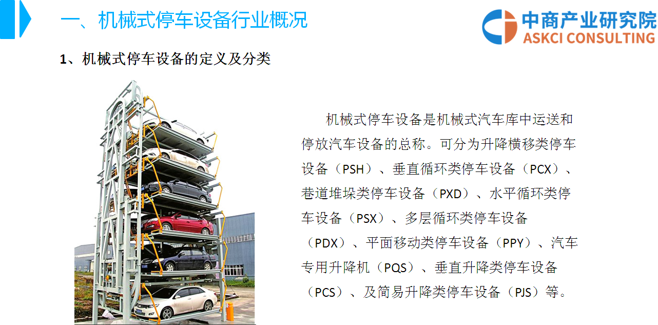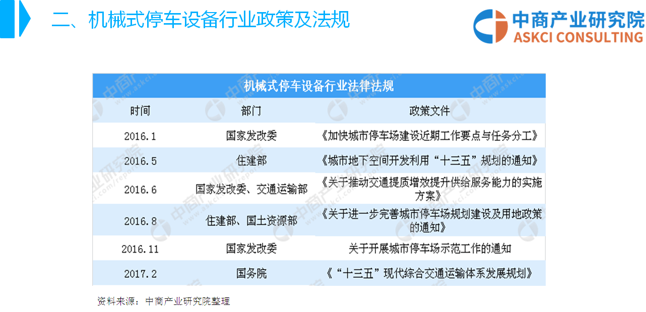 中商情报网讯:机械式停车设备是机械式汽车库中运送和停放汽车设备的总称。近年来,为缓解城市停车难问题,国家出台了一系列产业政策鼓励城市公共配套停车位建设,机械式停车设备以占地少、建设方便、运营高效的特点,受到国家政策的重点扶持。