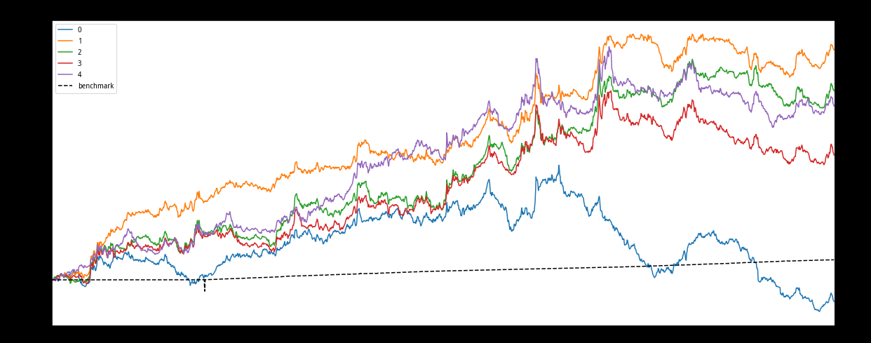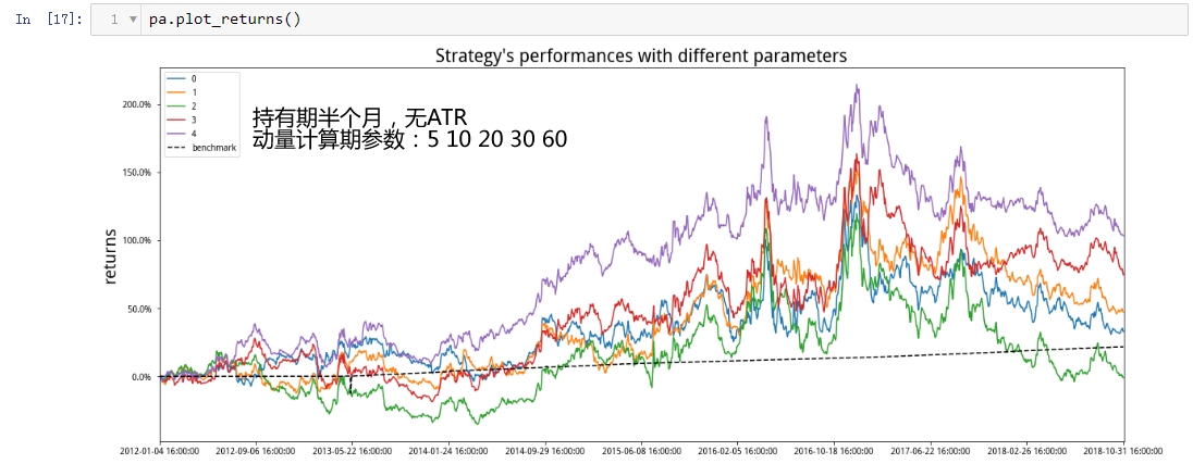 切换回到5日调仓,以等资金模式测试,变化动量计算周期参数,得到下图。直观感受是,盈利更高了,回撤更小了,在2016年之后模型的盈利保持情况较好: