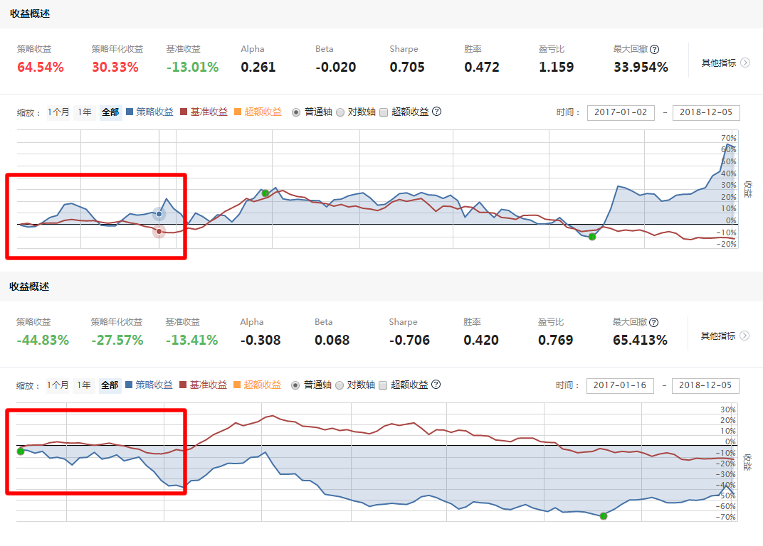 比如我们从2017年1月2日和1月16日,两个不同的回测周期运行模型,会得到不一样的结果,在某些品种上差异还挺大。实际上我们发现,上图中下半部分回测只不过是错过了关键的一两次开仓,导致整体收益大幅度落后上图。这属于测试中的重要误差。