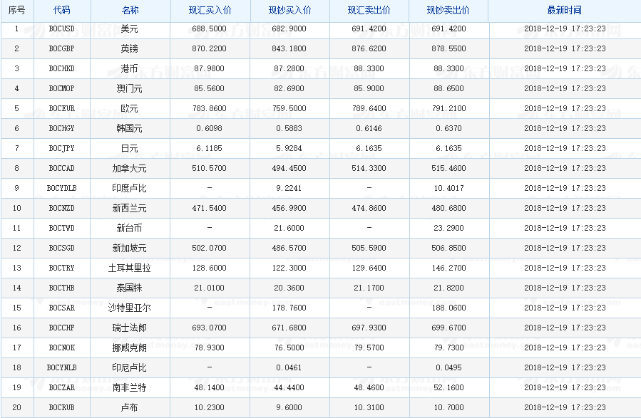 中国银行外汇牌价 2018-12-19(图片来源:东方财富网)