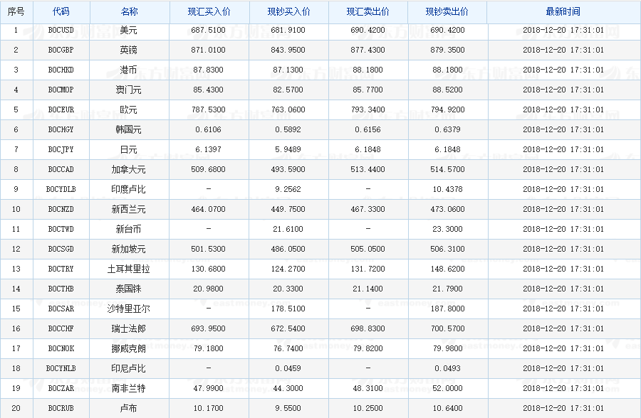 中国银行外汇牌价 2018-12-20(图片来源:东方财富网)