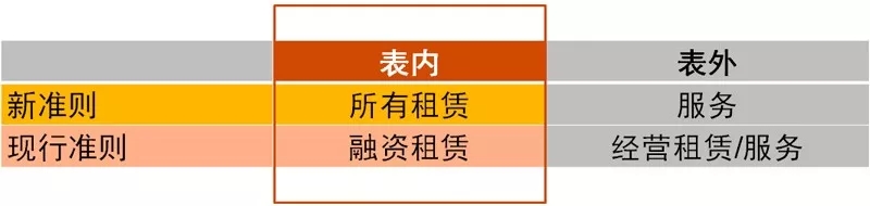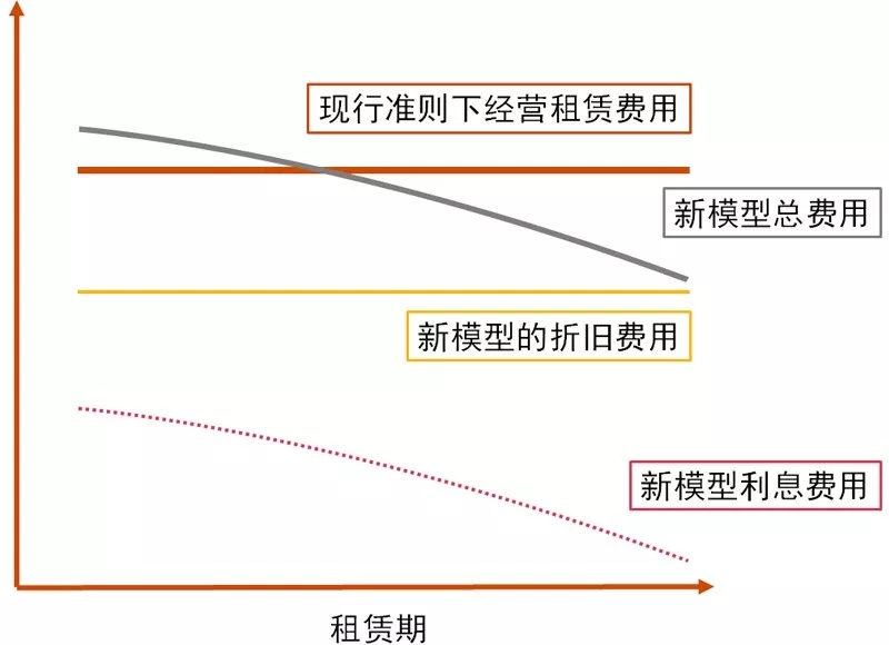 根据现行准则,承租人对融资租赁和经营租赁分别采用“上表”和“不上表”两种截然不同的会计处理,新租赁准则提出全部“上表”的单一模型。除了满足豁免规定的情况外(短期租赁和低价值资产租赁),几乎所有租赁均需要上表,意味着承租人的资产负债表将随着现时经营租赁的租金承诺而相应大幅度膨胀。此外,经营租赁承租人的费用分摊方式,将由现行的直线法变为与融资租赁一致的“前大后小”模式,即在租赁期的前半段时间内的总费用(即资产折旧加上利息)要高于现行准则下直线法确认的经营租赁费用。