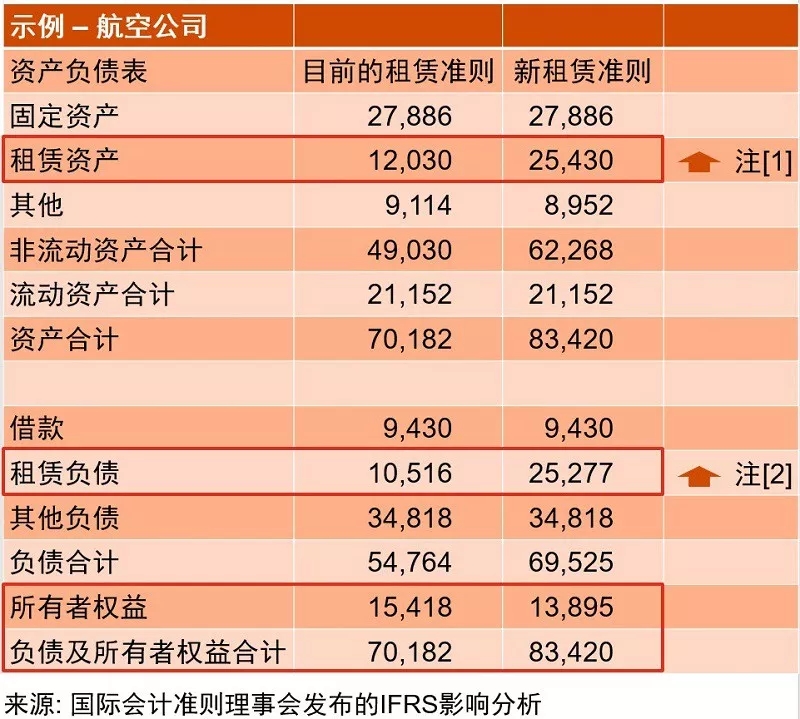 根据国际财务报告准则理事会发布的影响分析报告,下面以某航空公司为例,用数字说话,展示新租赁准则对财务报表及相关财务比率的总体影响。