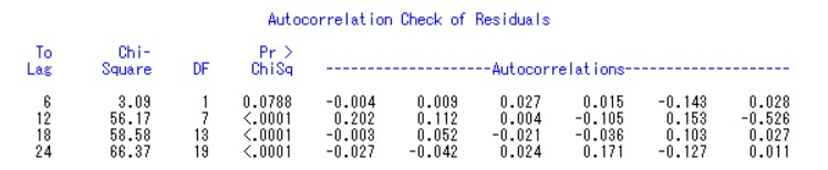 如题,ARIMA模型残差白噪声检验只有延迟6阶LB统计量显著大于0.05,延迟12、18、24阶的LB统计量p值均小于0.05,残差序列是白噪声序列嘛?