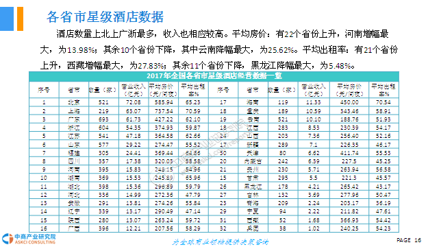 根据国家旅游局公布的星级酒店收入及客房数据,2016年是酒店行业动荡的一年,从“营改增”落地到万豪正式收购喜达屋,从经济型酒店日趋激烈的竞争环境到公寓民宿不断侵蚀市场,酒店业愈显多元化和融合性。国内星级饭店经历了一个完整周期后,2017年开始复苏。2017年全国星级酒店平均房价为359.17元/间天,平均入住率为60.40%,同比去年上升3.50%。预计未来新增供给相对有限,需求在消费升级驱动下将保持稳定增长,因此国内酒店市场的供需关系将继续保持向好趋势。