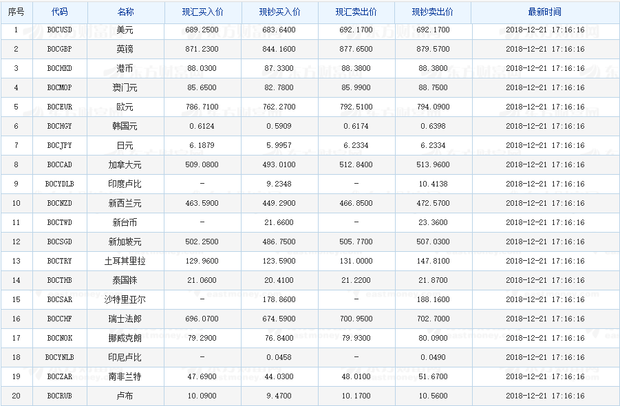 中国银行外汇牌价 2018-12-21(图片来源:东方财富网)