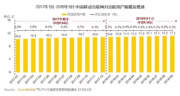 2、移动互联网活跃用户规模增速同比降低超50%,2018年前9个月移动互联网的总用户规模只增长了3400万,而去年同期是6400万,如图: