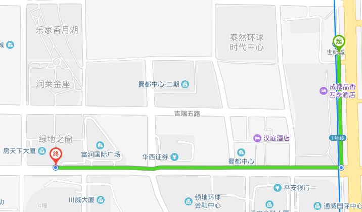 地铁1号线世纪城站B口出,向正南方向出发,沿天府大道中段辅路走340米,右转进入天府二街,直走850米到达绿地之窗写字楼(如上图)。