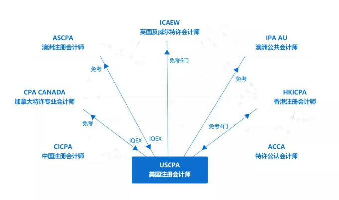 如所示,USCPA执照还可以与香港注册会计师公(HKICPA),加拿大特许专业会计师(CPA CANADA),英国及威尔特许会计师(ICAEW),澳大利亚公共会计师(IPA AU)等进行资质转换及免试。