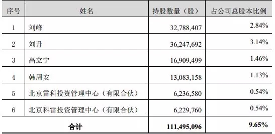 2018年7月13日,公司公告董事兼总经理刘峰先生、副董事长兼副总经理刘升先生、董事兼财务总监兼副总经理高立宁先生、董事兼副总经理韩周安先生以及北京雷科投资管理中心(有限合伙)、北京科雷投资管理中心(有限合伙) 签署了《一致行动协议书》,上述6位股东合计持有雷科防务1.11亿股: