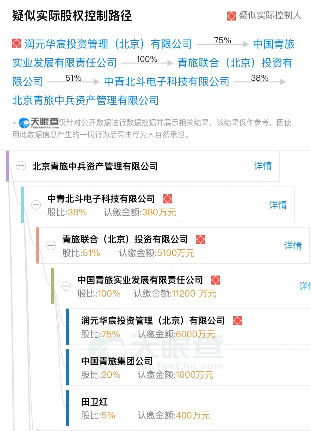 2018年9月,常发集团拟转让其剩余股权给上述三家公司时,深交所就关注到了青旅中兵的情况,怀疑其资金实力,并向雷科防务发了问询函。小兵用天眼查穿透青旅中兵第一大股东情况如下: