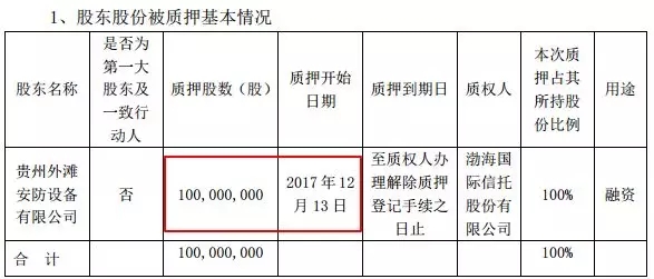 2017年12月14日,的雷科防务10,000万股无限售流通股份转让给贵州外滩安防;股份到手后,外滩安防立即将其质押: