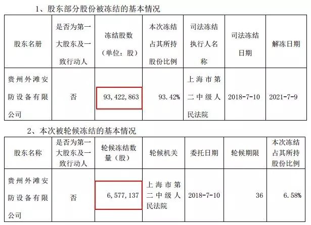 然而好景不长,3月16日,雷科防务就收到了华融华侨资产管理股份有限公司《关于处置雷科防务股票的告知函》,原来,2017年12月13日华融华侨通过渤海信托设立的“渤海信托•雷科防务股票收益权单一资金信托”受让了外滩安防合法持有的雷科防务10,000万股股票收益权,受让价款6.5亿元人民币,期限3个月。外滩安防以其持有的雷科防务10,000万股股票提供质押担保,2018年3月14日到期后外滩安防到期无法回购。2018年7月份有财经媒体曝出外滩安防牵涉一家名为“中精国投”的私募基金兑付危机中,涉案资金超过18亿元。很快,外滩安防持有的这1亿股全部被法院冻结,至本文成为之时,再无消息,此为第一军: