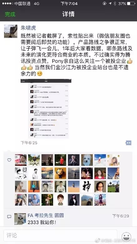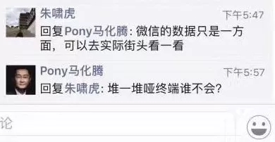 于是,2017年6月19日,朱啸虎在朋友圈转发一篇“ofo领先摩拜”的文章为ofo站台,并评论称“和街头实际数数的感觉基本一致”。有趣的是,这条评论,被马化腾看到。马化腾显然对文章数据不信服,留言称:“从微信支付看摩拜高一倍多”,顺带还diss了一下ofo在智能化方面的落后。