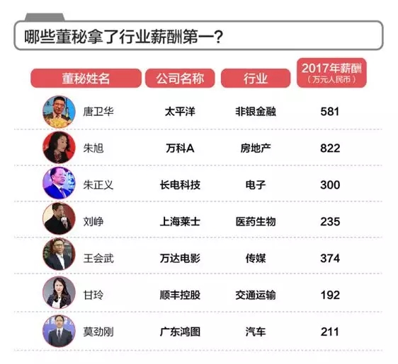 在2018中国A股上市公司董秘薪酬榜上,榜首为万科A的董秘朱旭,其2017年的税前年薪(下同)为822万元人民币。太平洋的唐卫华、海通证券的姜诚君则位居第二、第三名,年薪分别是581万元人民币、547万元人民币。位列第四、第五的董秘分别是国泰君安的喻健、泛海控股的陈怀东,年薪分别为523万元人民币、486万元人民币。