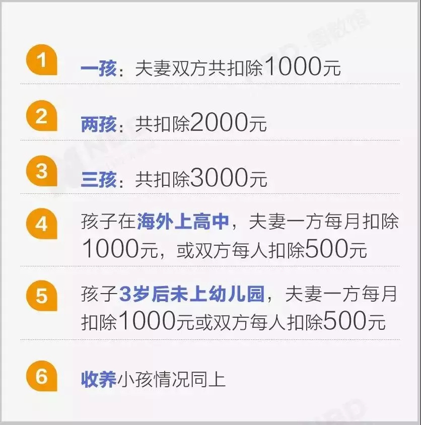 子女从满3周岁至教育结束,不论处在什么教育阶段,不论是在中国境内还是境外接受教育,均可按照每个子女/月扣除1000元,或由夫妻双方每人各扣除500元计算。