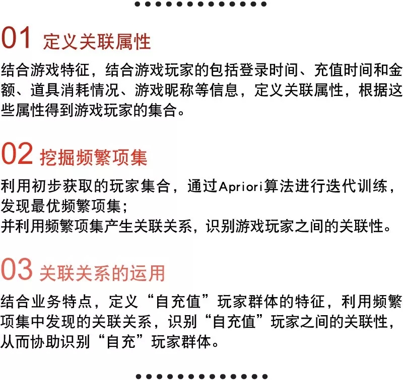 借助数据分析方法,我们可结合游戏玩家的包括玩家充值账号、IP地址、设备号码、游戏昵称等信息,对游戏玩家的充值行为进行关联分析,利用Apriori算法,挖掘频繁项集,了解游戏充值玩家的关联性,结合关联玩家的充值金额、充值频次等游戏行为数据,协助识别该类自充值行为。