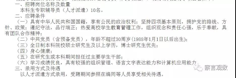 这一种同人事代理,工资待遇参照在编,社保基数会略有差别。通常在招聘公告中会写明,不过这种情况的高校非常少。如下图,某高校招聘辅导员以人才派遣方式聘用,并且已说明相关待遇是参照在编同等人员,应聘者在应聘过程中可以通过对公告解读,了解编外人员待遇问题。需要注意的是,从国内整体情况来看,辅导员岗或思政教师岗较为特殊,绝大多数高校均是以正式事业编制的方式直接聘用。
