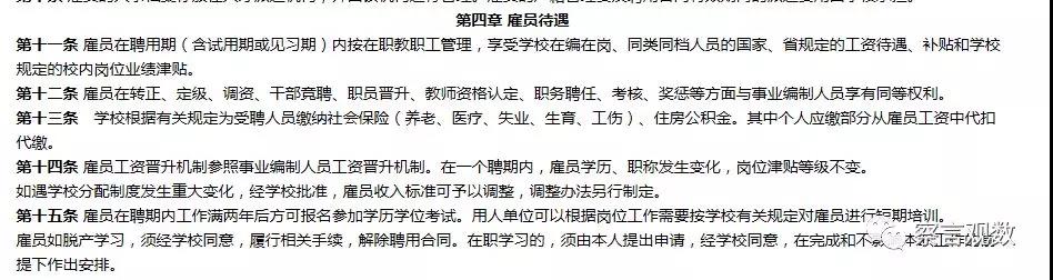 对于此种状况,不建议具备硕士研究生学历的应聘者考虑这种聘用方式,因为晋升也是需要花时间和精力。与其如此,不如选择「同工同酬」编制外聘用方式的高校,这样努力和回报是成正比。具备硕士研究生学历的应聘者,在学历门槛上是符合参加事业编制或者「同工同酬」编制外聘用方式的行政教辅岗位的招聘要求,所以尽量不要选择「非同工同酬」方式的编外聘用而耽误了自己。
