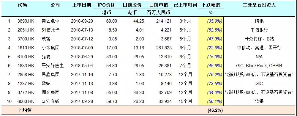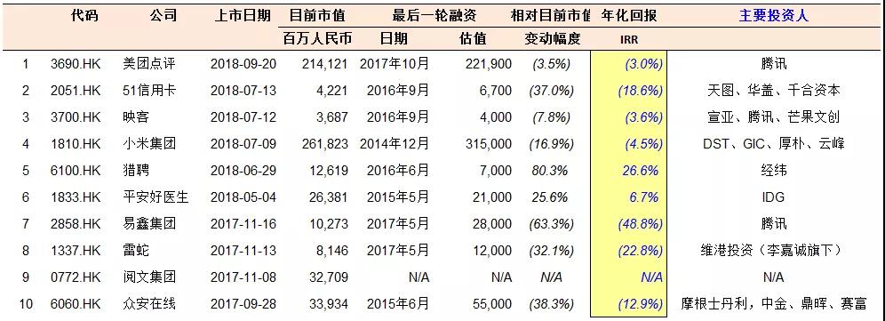 2017年9月至2018年9月,港股恰好上市了十只“科技独角兽”。其中包括千亿市值的小米、美团;也有“三马”加持的众安保险;有腾讯重金投入的易鑫集团、阅文集团;也有一时风光无限的明星映客。