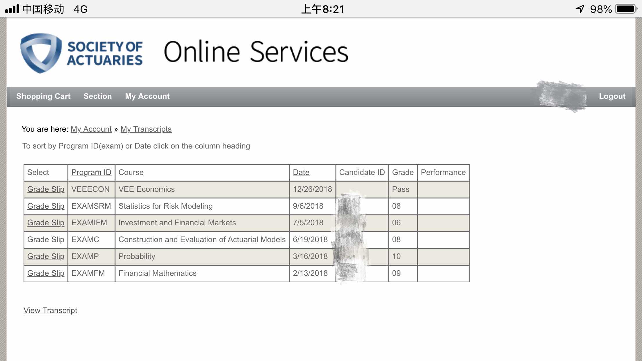 随后只要有考试窗口就都报名了,几门考下来,FM和P作为SOA基础课中的基础课,学扎实一点对复习后面的考试帮助很大。复习最辛苦的时候是准备C和IFM。6月是C最后一次的考试窗口,考虑到以后换成STAM后会有新变化,而且据说C在新标准下还可以抵扣VEE的statistics,所以C这次一定要过了。IFM报名时有些犹豫,因为考完C之后留给复习IFM时间太少了,但考虑IFM第一次开考,决定不管过不过,先去摸摸底。没想到考完C之后又出差一个礼拜,实际只复习了10来天,考完估计要挂,结果出成绩时看到自己的candidate id,查分数6分低分通过还挺开心的。从花的时间上看,IFM是性价比最高的一门了。