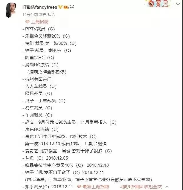 网友“IT猎头fancyfrees”网曝互联网公司裁员一览表