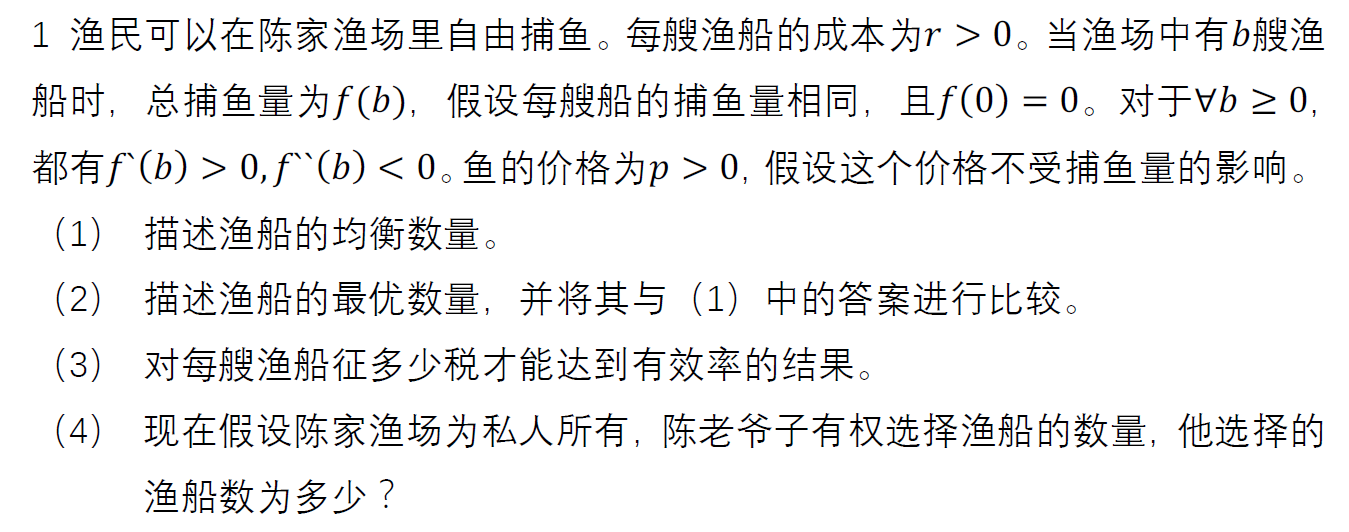 渔民可以在陈家渔场里自由捕鱼。每艘渔船的成本为𝑟 > 0。当渔场中有𝑏艘渔船时,总捕鱼量为𝑓(𝑏),假设每艘船的捕鱼量相同,且𝑓(0) = 0。对于∀𝑏 ≥ 0,都有𝑓`(𝑏) > 0, 𝑓``(𝑏) < 0。鱼的价格为𝑝 > 0,假设这个价格不受捕鱼量的影响。