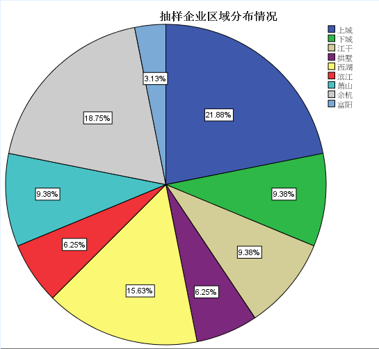 在抽样的32家企业中,其中健身服务业有14家,占样本的43.8%,体育培训业有8家,占样本的25%,体育场馆租赁业有10家,占样本的31.3%。从企业注册地的区域分布来看,杭州主城区企业数量相对较多,而郊县企业数量较少。